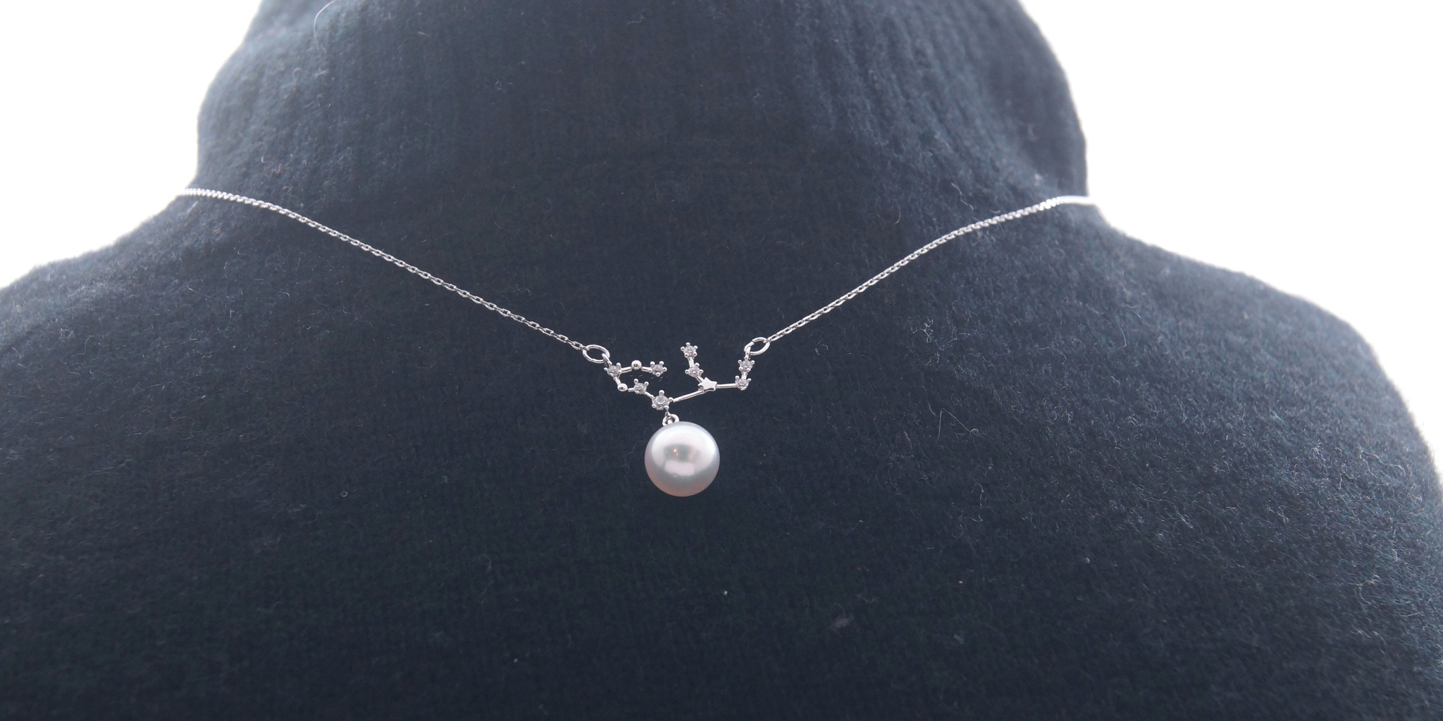 華奢なチェーンにおとめ座のペンダントトップを合わせた一粒パールネックレス。タートルネックに合わせることで首回りが華やかになります。
